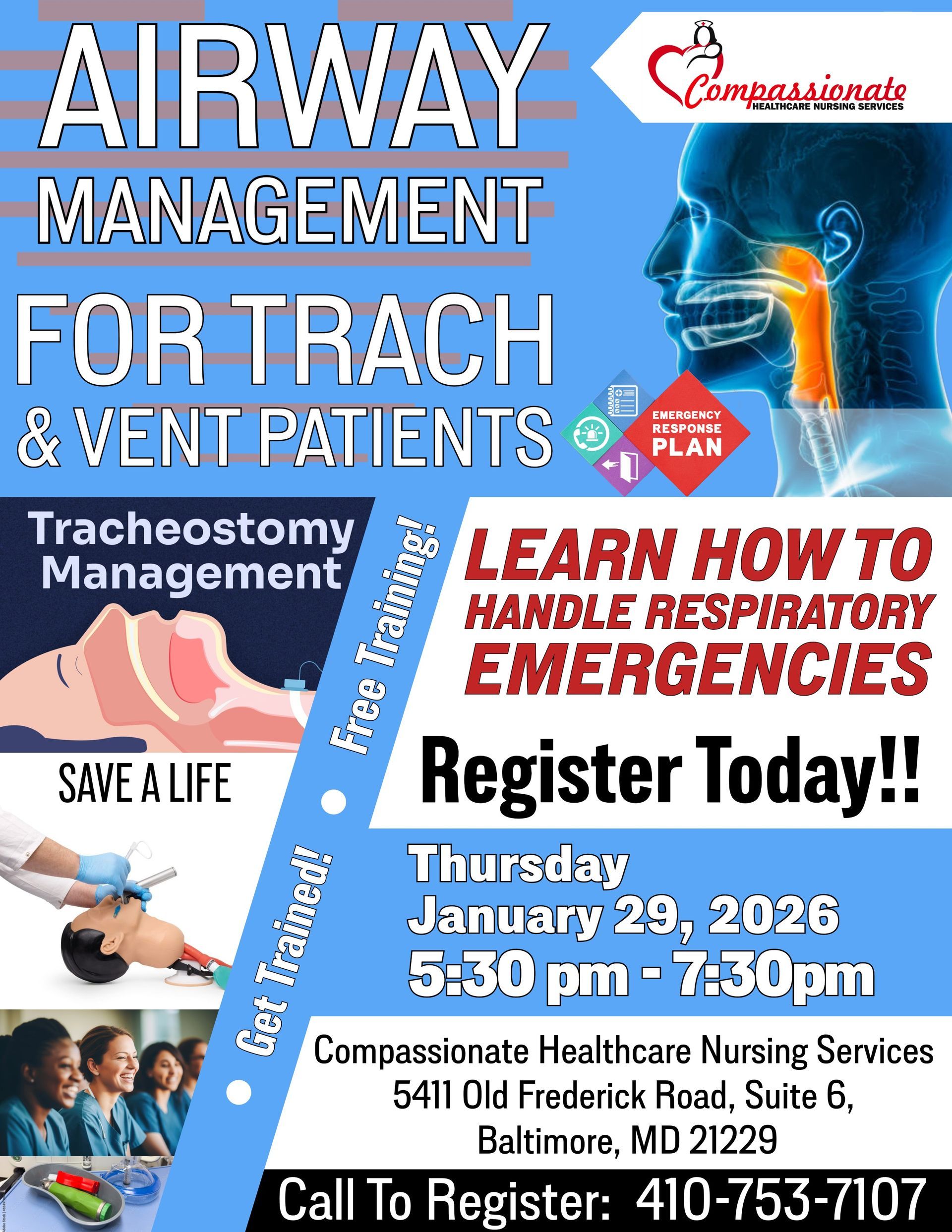 Join Compassionate Healthcare for our Airway Management for Trach & Ventillator Patients. Register for this class to review, update, and fine-tune your nursing skills. This Free in-person class can help you handle respiratory emergencies and save a life. January 29, 2026 - 5:30pm to 7:30pm Click Here to Register Today!! Call for more information! 410-719-0672